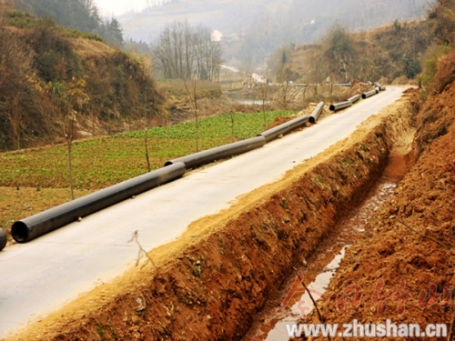今日竹山网消息 12月25日,记者在谭家河灌区总兵安段施工现场看到,一台台挖掘机正挥舞着长臂开挖地下管槽,工人们正紧张有序地安装PE500供水管,近12公里管线开挖施工全面铺开。