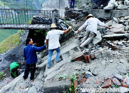 今日竹山网消息 横跨堵河的钻碳岩索桥建于上世纪80年代,从建设时间和跨度上都堪称堵河第一索。随着十竹路建设的推进,连接文峰乡钦峪村和楼台乡兴旺村的钻碳岩索桥将成为十竹路旁的一道风景。9月26日,工人正在加固索桥底座,保障公路及索桥安全。(袁斌)