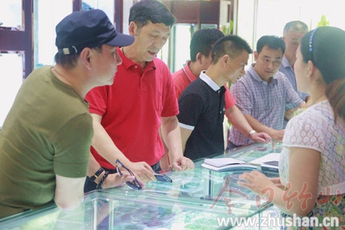 吃过午饭,卢奇、王胜利一行首先考察了国际绿松石城,在这里他们考察了绿松石城的店铺,以及店内琳琅满目的绿松石产品,卢奇兴奋的赞道:“竹山了不起,有这么多宝贝”。当大家知道王胜利先生是央视寻宝节目核心鉴定专家时,大家情不自禁的围过来向他讨教,王胜利现场讲解了有关绿松石的历史、鉴定绿松石真伪和品级的方法,以及绿松石目前在国际国内的行情,听得大家拍手叫好,仿佛这里成了鉴宝节目的现场。随后,卢奇一行登上金龙凤凰城的高处俯瞰竹山县城全景感觉美不胜收、心况神怡,对竹山的好山、好水赞不绝口。卢奇站在高处挥着手风趣的说:“竹山是个好地方,我一定要多到这里走一走、看一看”。