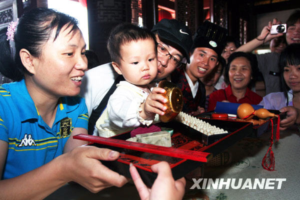 ![]() 5月30日,一名周岁女孩在祈福礼上抓周。当日,为庆祝“六一”节,福建省第二届周岁祈福礼在福州文庙举行。30名周岁孩童在家长的带领下,面对孔子塑像,祈福抓周。抓周又叫“试儿”,在民间流传已久,它是小孩周岁时举行的一种预测前途和性情的游戏,是第一个生日纪念日的传统庆祝方式。新华社发(郑帅 摄) ![]() 5月30日,一名周岁女孩在祈福礼上抓周。新华社发(郑帅 摄) |