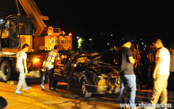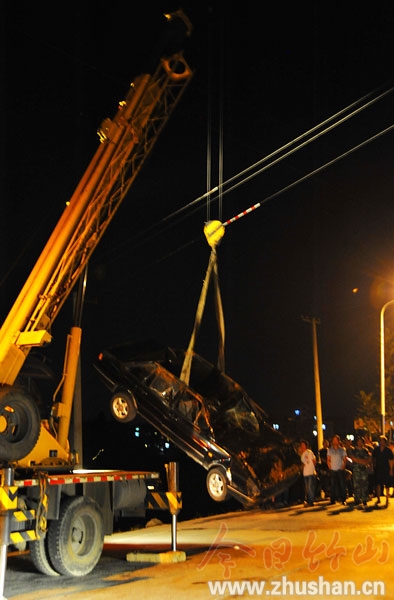 今日竹山网消息 8月20日21点29分,一辆严重损坏的黑色小轿车被大型吊车从路外高坎下吊起,在工作人员的协助下回到公路上。