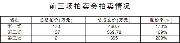 统计数据显示,前3场共拍卖车辆300辆,总起拍价428万元,总成交价1201.48万元,总溢价率达181%,总成交率100%。