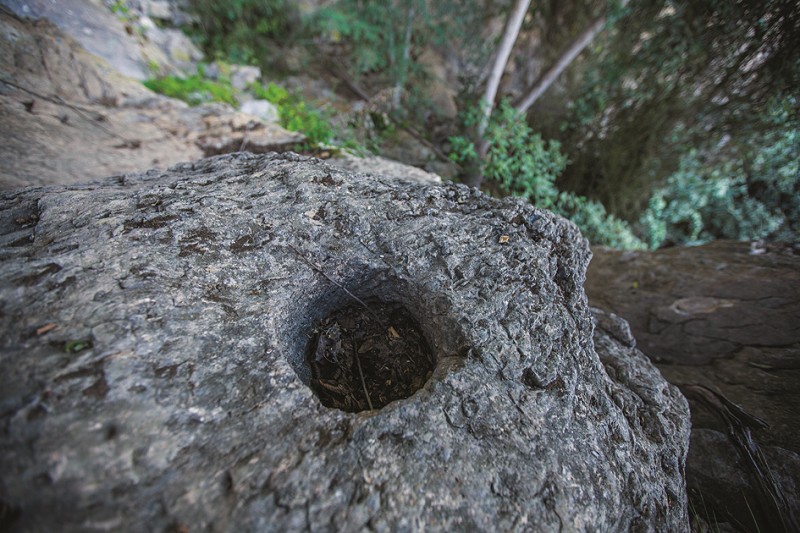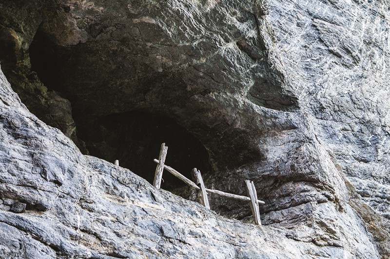 盐道上大多修建有栈道,在买卖街还保留着古栈道的痕迹。据随行的墨池村党支部书记李刚寿介绍,买卖街上的古栈道是在悬崖峭壁上凿出横洞,穿上横木为梁,并在岩石上凿出竖洞,插上竖木作为横梁中一端的支撑,然后在横梁上铺木板成道,栈道一侧装有栏杆,有的加盖顶棚。