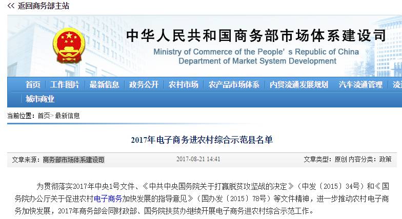 为贯彻落实2017年中央1号文件、《中共中央国务院关于打赢脱贫攻坚战的决定》(中发〔2015〕34号)和《国务院办公厅关于促进农村电子商务加快发展的指导意见》(国办发〔2015〕78号)等文件精神,进一步推动农村电子商务加快发展,2017年商务部会同财政部、国务院扶贫办继续开展电子商务进农村综合示范工作。