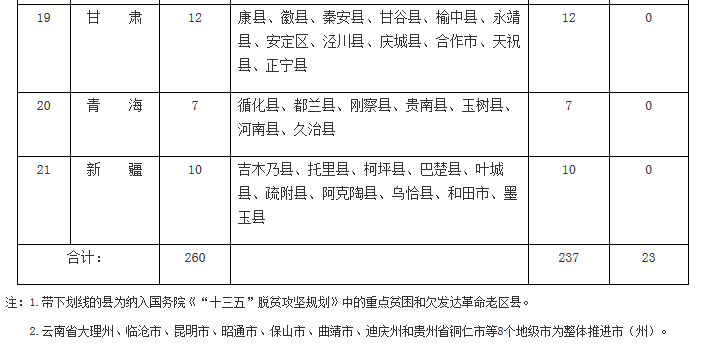 2017年综合示范工作进一步向贫困地区和欠发达革命老区倾斜。示范区域包括21个省(区),均为国家扶贫开发工作重点县、集中连片特殊困难县(以下简称国家级贫困县),以及国务院《“十三五”脱贫攻坚规划》确定的重点贫困和欠发达革命老区所在的省(区、市)。地方经过竞争性选择,确定了260个示范县,其中国家级贫困县237个,占总数的91.2%,重点贫困和欠发达革命老区县23个,占总数的8.8%。
