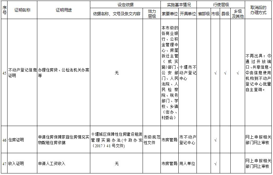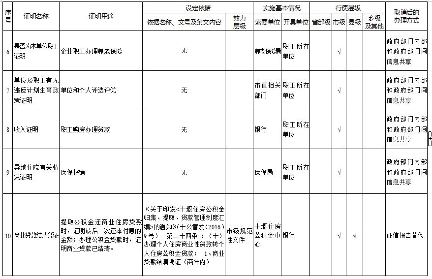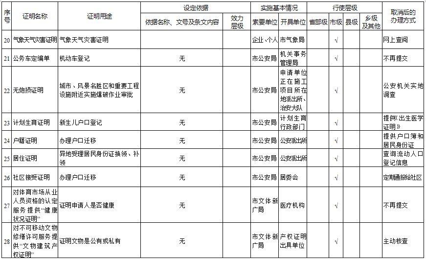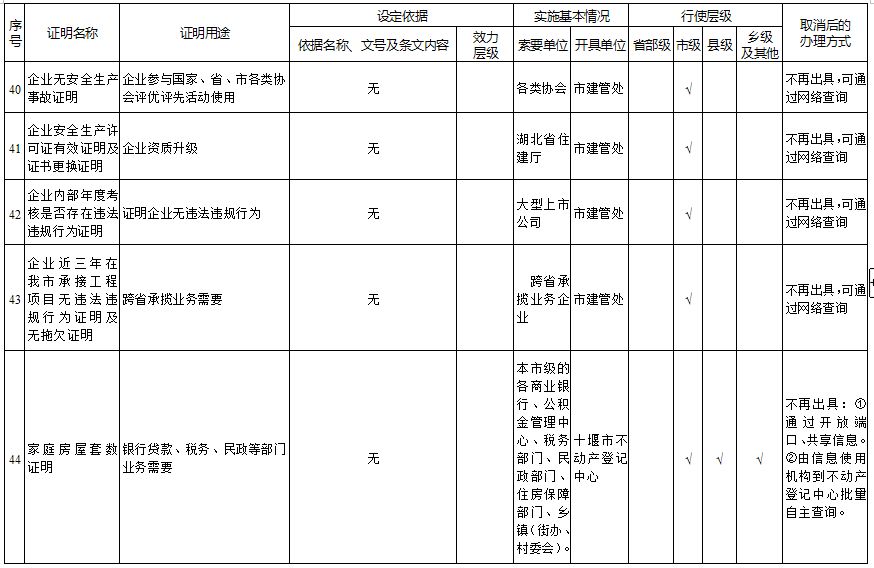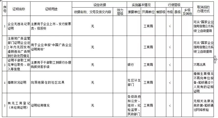 在这些取消的事项中,部分可以通过网上自助查询。例如,企业无违法记录证明、学历证明、企业无安全生产事故证明、家庭房屋套数证明等;部分事项是今后不再出具(收取、提交),例如证明干部职工所在单位职务等信息、购房所在地户籍证明、子女就读学校证明、亲属证明等;部分事项是政府部门内部和政府部门间信息共享,例如是否为本单位职工证明、异地住院有关情况证明等;部分事项是通过网上申报相关部门网上审核,例如住房证明、收入证明等。