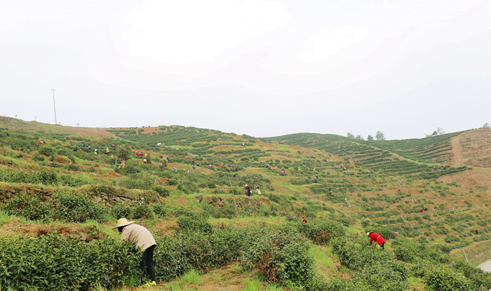 这边技术宣讲正热,那边春意正浓茶正香。随着气温回升,溢水镇各处茶园已陆续进入春茶采摘期。上午九点刚过,何家湾茶叶基地里。近百余名茶农胸挂竹篓,忙碌于茶园之中采摘“明前茶”。去年何家湾村新建茶园1147亩,引进湖北三盛茶业有限公司参与茶园建设和茶叶深加工,同时县农业局争取350万元资金在何家湾冷家坪建设占地100亩的无性系茶叶产业试验示范基地,小小的茶叶正为该村带来脱贫的新路子。