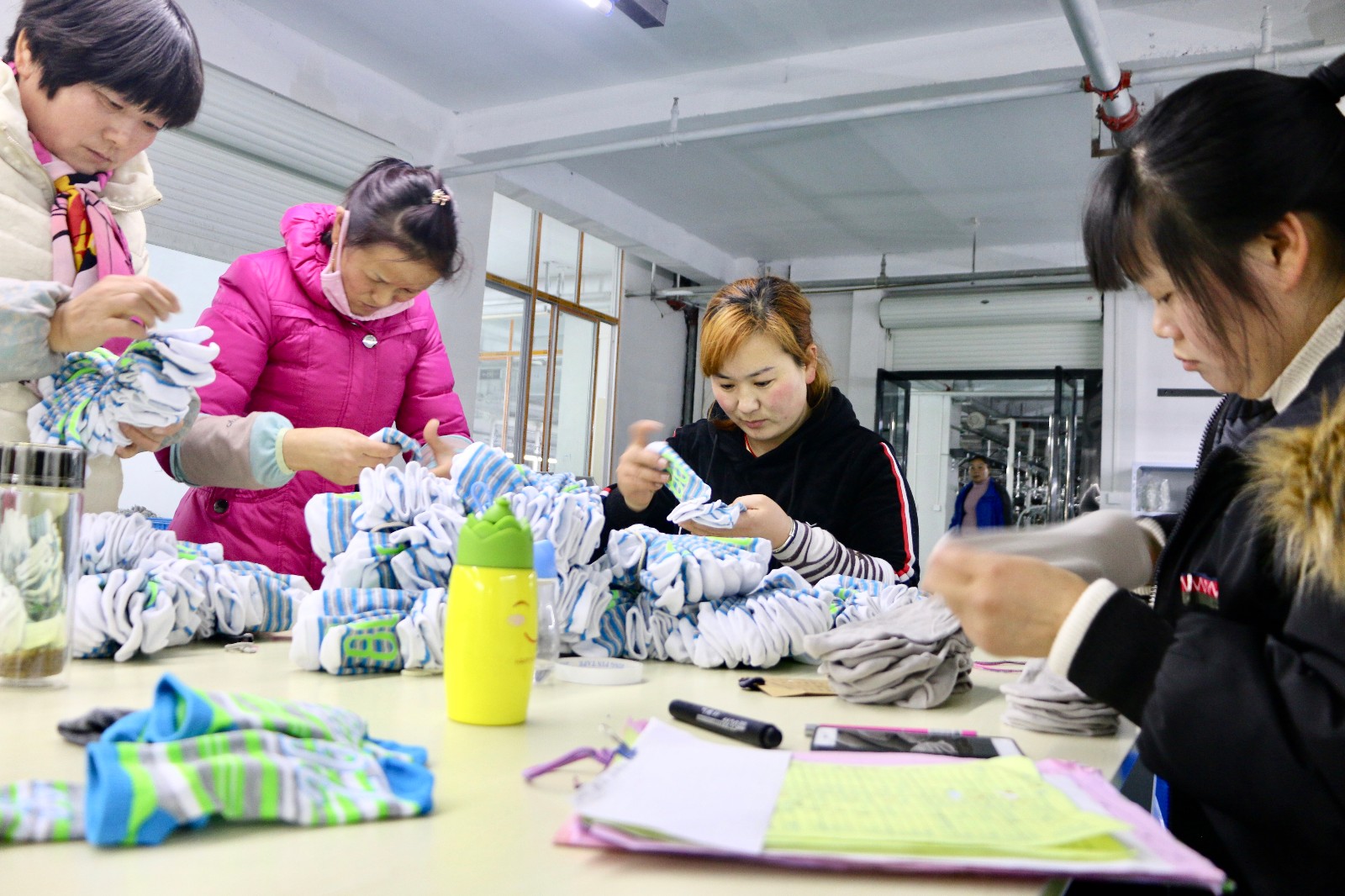 “按这种计件的方式结算工资,熟练一点的员工每天可以制袜1500双以上,后期还有很大的上升空间。我们还设置了全勤奖,除去每月4天休假,每月工作27天就能拿到全勤奖,奖金200元左右,工人们积极性都很高......”车间负责人陆经理介绍道。