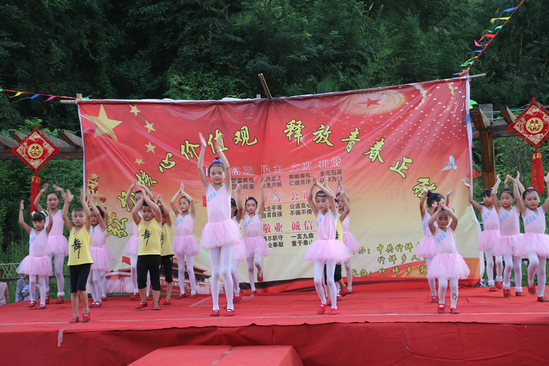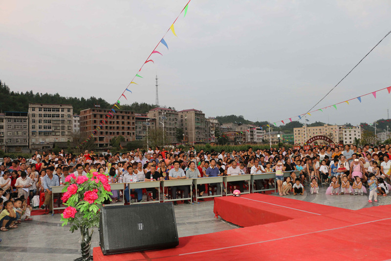 7时许,晚会正式开始。来自该乡的20名小朋友表演了开场舞《cilicili》,拉开了本次活动的序幕。接着该乡干部、群众轮番上场,热情洋溢的舞蹈、满怀激情的歌曲、声情并茂的朗诵、妙趣横生的小品、激情澎湃的广场舞等节目依次上演。《扶贫礼赞》、《歌唱祖国》、《没有共产党就没有新中国》、《公民道德歌》、《赶快行动保护环境》等节目,一次又一次地把晚会演出推向高潮。广场上掌声雷动,群众纷纷叫好。