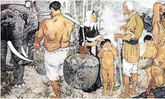 古时盘古生在一片漆黑中,他不能忍受黑暗,用神斧劈向四方,逐渐使天空高远,大地辽阔。但他害怕天地重新合拢在一块,就用头顶着天,用脚踏住地。经过一万八千多年的努力,盘古变成一位顶天立地的巨人,而天空也升得高不可及,大地也变得厚实无比。