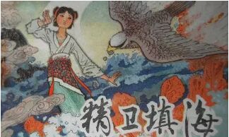 相传太阳神炎帝有两个女儿,大女儿的名字叫瑶姬,小女儿的名字叫女娃。因久居天宫无聊,有一天,女娃驾船游东海而溺,其精灵化作花脑袋,白嘴壳,红色爪子的一种鸟,栖息在发鸠山,发出“精卫、精卫”的悲鸣,人们便将此鸟叫作精卫鸟。