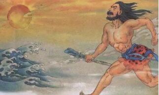 相传在黄帝时代,夸父族首领想要把太阳摘下,于是开始和太阳赛跑,在口渴喝干了黄河、渭水之后,在奔于大泽路途中渴死,手杖化作桃林,身躯化作夸父山。