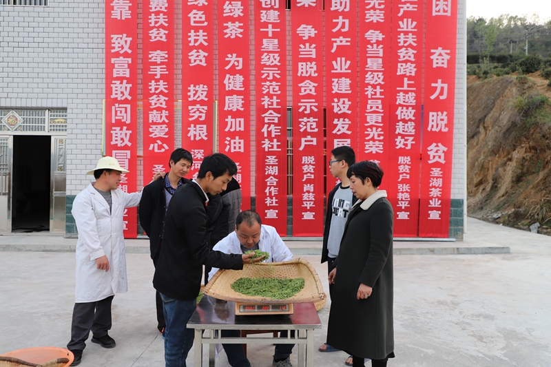 有了绿色产业的有效带动,井泉村的精准扶贫工作卓有成效,2016年底,该村就摘掉了贫困帽。该村三组村民任传明,现已54岁,妻子残疾,两个孩子只有6岁、1岁,无法外出务工。在圣湖公司技术员的帮助下,任传明将已经荒芜的3亩多茶园重新修整,当年卖鲜叶的收入就超过两万元,年底就脱贫了。