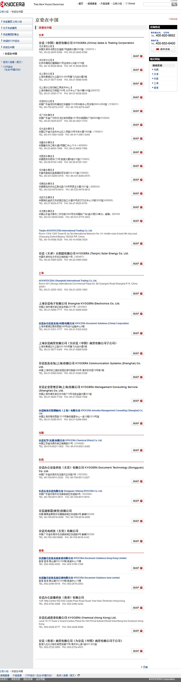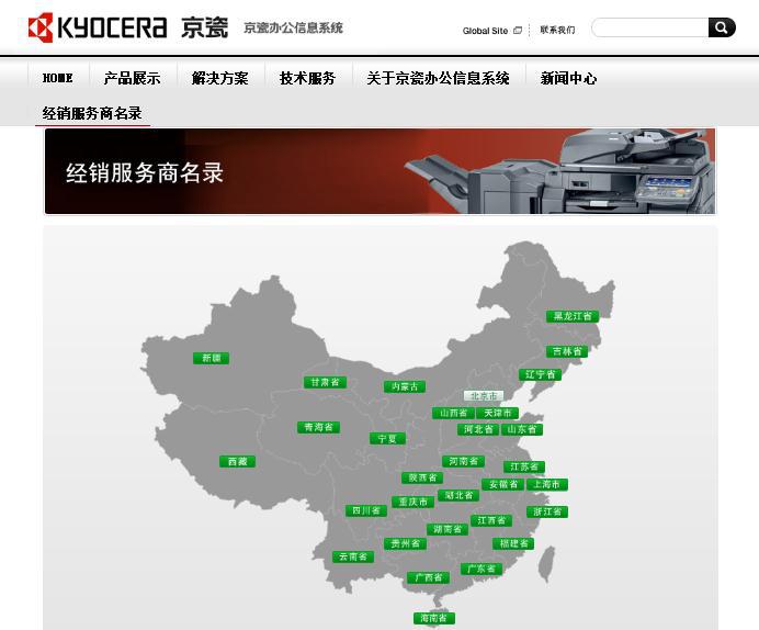 据京瓷集团官网显示,该集团在中国总公司位于天津,其他各地分公司及办事处共有31处,分别位于北京、天津、上海、深圳、广州、大连、重庆、西安、长春、青岛、武汉、济南、无锡、东莞、香港。而在京瓷集团的子公司“ 京瓷办公信息系统(中国)有限公司”官网中,查询某一产品的“授权经销服务商名录”显示,经销商遍布中国的多个省、市、自治区。由此可见,该公司业务所涵盖地区范围远超该PC端官网的“京瓷在中国”的示意图。