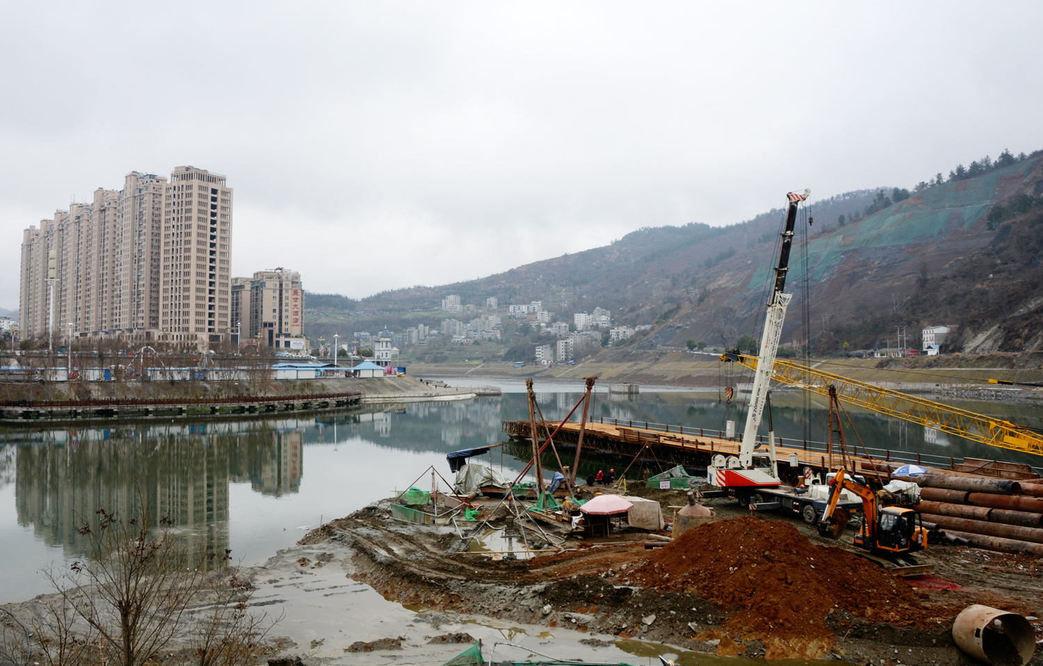 今日竹山网消息 3月3日,“老牛老马都歇驾”的正月十六,堵河廊桥工程仍在紧张施工中。记者在现场看到,桥桩施工已延伸到堵河中心线位置。堵河廊桥工程的实施,将使竹山县城区核心作用进一步凸现,从而拓宽城市空间、优化城区布局、开辟县域经济新的增长极。(袁斌 毛伟摄)