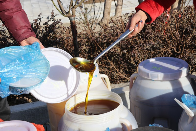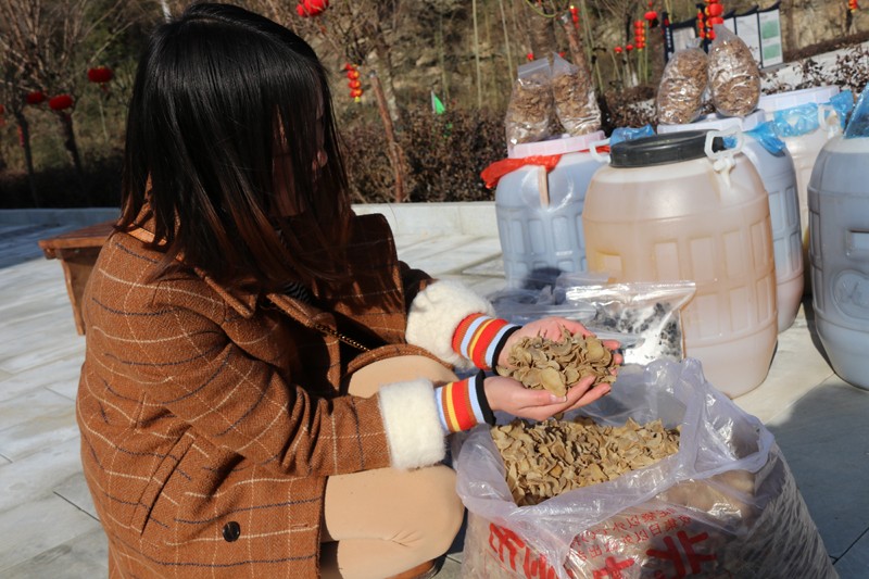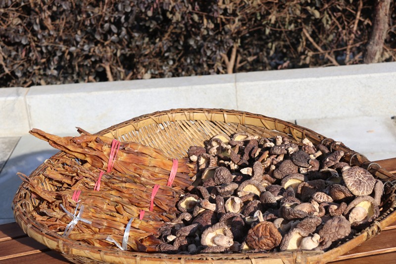徒步进入太和梅花谷内,到处都是粉墙黛瓦,炊烟缕缕。到了农家小院,农户们正忙着晒酱豆、熏豆腐干、腌腊肉、熏香肠,还有已经晾晒好的野竹笋干、香菇、木耳、豇豆干、洋芋干、红花生,腌泡好的酸菜、豆腐乳,刚刚从地里挖出来的山药,本地的土鸡蛋、黑毛猪、豆芽……除了这些,还有自己压榨的花生油、菜籽油,酿造的大曲酒等,这些土乡土味的农特产品,看着让人垂涎欲滴。