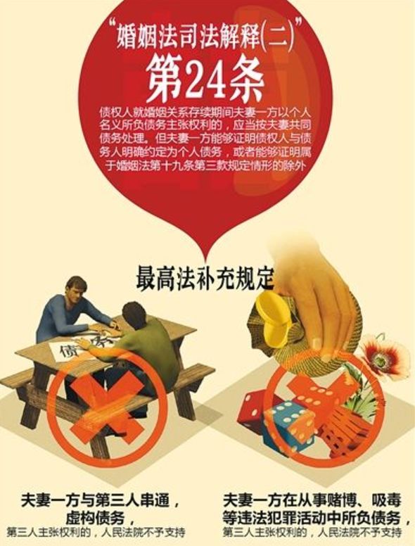对备受关注的婚姻法解释二第24条,进行了细化和完善,最高人民法院关于审理涉及夫妻债务纠纷案件,适用法律有关问题的解释。