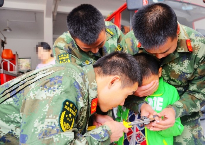 今日竹山网消息 10月19日12时30分,宝丰派出所民警带着一对母子来到消防中队,男孩的手被铁环“卡”住,请求竹山消防官兵帮忙摘除。