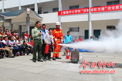 会上,上庸镇派出所副所长(上庸镇中心学校法制副校长)谭显林举案从“涉校案件、打击校园周边违法犯罪、青少年违法犯罪的成因和预防青少年违法犯罪”等角度深入浅出的进行了法制知识宣讲;县交警大队三中队队长李铭以发生在身边的交通事故举案说法,并结合上庸镇区域特点现场教给了青少年走路、乘车的方法;县消防大队中队长张财宏以“火灾发生的原因、火灾的预防、火灾的处理方法”进行了消防知识宣讲。最后,消防官兵现场进行了灭火演练,现场教学灭火方法。上庸镇中心学校部分师生也兴趣高昂的参加了灭火演练。