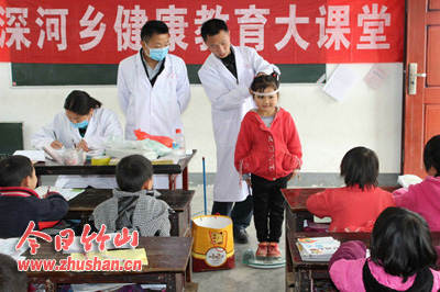 今日竹山网消息 4月23日,深河乡中心学校联合乡卫生院在茅坝村教学点开展健康教育大课堂活动,同时对该校学生进行免费体检。长期以来,村级教学点因为位置偏僻、学生人数少,师资弱,学生健康得不到重视,为了改变这一现象,深河乡中心学校与乡卫生院联合开展健康教育大课堂活动,促进薄弱学校特别是村级小学重视开展健康教育活动,重视学生体检,以促进所有学生成长。(陈前锋 张宗福)