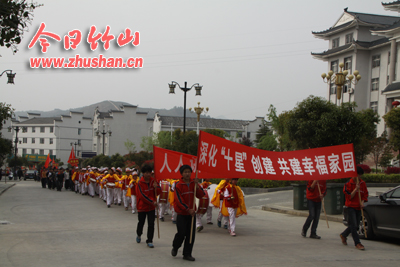下午两点,身着整齐校服的学生们分成三个方阵沿着双拥路开始巡游,高擎文明标语的学生方阵先行,鼓乐方阵紧随其后,宣讲主力方阵则通过浩大的声势和响亮的口号向集镇群众们展示了学生积极参与文明创建的热情。在巡游过程中,“文明宣讲军”始终精神抖擞,各个方阵的文明口号此起彼伏,鼓乐声不绝于耳。“文明学生军”经过上庸镇标,沿庸城大道、湖滨路、三盛路、黄州路等几条人流量较大的主干道进行巡游和宣讲,所到之处群众无不对他们行“注目礼”。家住三盛路的李善明就是听到孩子们的口号声才从家里出来看看热闹,他认为,学生群体比较单纯,他们参与“十星”文明的热情可以感染到很多的普通群众,而且还能从小培养孩子们的社会责任感,这样的活动经常搞,也搞得很不错。