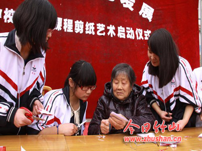 4月2日,竹山二中校本微型课程剪纸艺术正式启动。日前,该校充分挖掘教育资源,传承剪纸民间艺术,自主开发学校特色校本课程。邀请竹山县麻家渡镇柿树坪村四组省级第二批非物质文化遗产“传统美术类剪纸传承人”喻少贞作为指导老师。