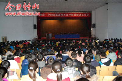 今日竹山网消息 “自信创造奇迹,拼搏实现梦想;态度决定一切,实力铸就辉煌。”铿锵有力的誓言在竹山一中大礼堂上空久久回荡。2013年 2月27日上午,竹山一中隆重举行了高考百日冲刺誓师大会,擂响了百日冲刺的战鼓,吹响了高考冲锋的号角,现场气氛热烈,师生们个个情绪高昂。