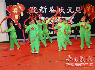 元旦晚会上,八(一)班学生表演的《最炫民族风》充满了青春的活力;八(二)班学生表演的歌伴舞《爱在人间》诠释了人间有爱,大爱无边;八(三)班学生自编自导的情景剧《向周丽学习》使周丽生动地“再现舞台”;七(一)班学生柯鹏飞表演的恰恰舞和五(一)班学生宋严严的电子琴演奏使观众大开眼界;七(二)班学生表演的三句半《学习十八大,身边变化大》结合十八大会议精神和学校的变化,使观众耳目一新;二(一)班学生表演的舞蹈《北京小妞》活泼可爱;七(二)班学生表演的舞蹈《欢乐中国年》将晚会推向了高潮。
