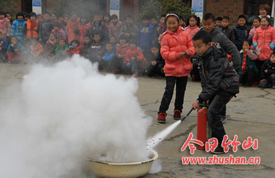 今日竹山网消息 “运用灭火器安全扑火方法,同学们都记住了吗?”“记住啦!”11月28日,在秦古镇秦古小学的体育场上,负责校园安全的教师正拿着灭火器向全校400多名师生讲授安全防火知识。从如何使用灭火器,发生火灾后如何从灾区中科学逃生等知识讲授,同学们听的认真,记的仔细。随后,部分学生在“大火”现场操作灭火器,实施安全扑火演练。(何培元 陈丽丽 杨勇)