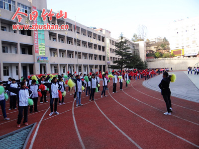 近几个周以来,无论是课间时间,还是课外活动时间,无论是七、八年级的学生,还是毕业班的学生,体育锻炼的热情都比平时要高得多,跑步的、投球的、跳高的、跳远的、跳绳的、练呼啦圈的等等,无不练得热火朝天,每到下午第七节课,该校操场就更加热闹。由各班挑选的学生组成的国旗队、会徽队、彩旗队、彩绸队、鲜花队、扇子队、绒球队、花环队等方阵,在训练老师的指导下,无不紧张有序地演练,就连周末,校园也不同往常,七年级的学生们忙着排练文艺节目,唱的唱,跳的跳,十分认真,八年级的学生忙着写字、画画,办展板,也是不亦乐乎。