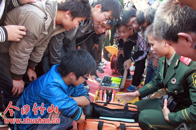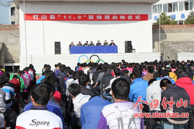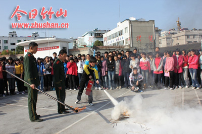 今日竹山网消息 11月6日下午,由县武警消防中队和竹山一中共同筹办的“11.9”宣传周启动仪式暨竹山一中消防知识讲座及应急演练活动在竹山一中田径场举行。来自县武警中队的参谋长就如何报打119、如何进行消防避险、防险等进行了专题知识讲座,并介绍了消防“十不准”;县武警中队消防官兵进行了现场消防演练,给学校师生上了一堂生动的消防安全课,增强了师生消防意识。此仪式的启动,也标志着全县公民消防宣传活动正式拉开帷幕,为十八大召开打下消防安全基础。(张生兵 李玲玲)