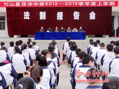 今日竹山网消息 10月25日下午,茂华中学隆重召开“法制报告会”。该校近2000名师生聆听了报告会,城关镇水陆派出所干警受邀做了法制教育专题报告。