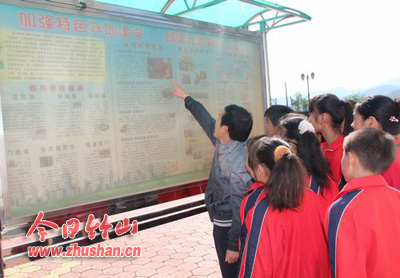 今日竹山网消息 10月18日,上庸镇中心学校教师和学生正在学校宣传橱窗观看“反邪教”宣传教育挂图。