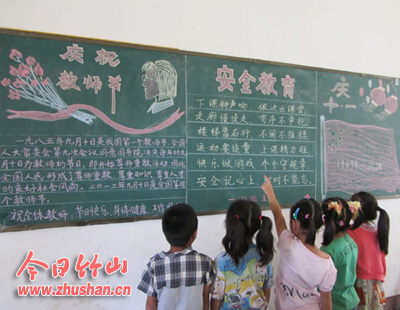今日竹山网消息 9月10日,溢水镇九年一贯制学校一年级学生正在黑板报前学习教师节及国庆节的相关知识。近年来,该校坚持素质教育为先,将课堂教育与课外教育相结合,利用广播、电视、黑板报等媒介,让学生了解更多的知识与信息。(章兵 朱名维)