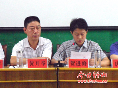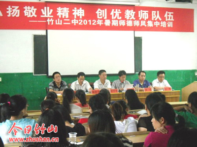 大会首先宣读了关于竹山二中新一届领导班子分工情况。接着校长贺进修作了关于《齐心协力,鼓足干劲,共同开创竹山二中更加美好的明天》的主题发言,新任领导班子将勤奋工作、不辱使命、廓清思路、明确目标、加快发展;师德师风教育要提高认识、注重实效、抓落实,着力解决困扰学校发展的师德师风方面问题,扬长避短,增强学校发展后劲;精心安排活动内容,严格落实“三讲”和剖析交流及以考助学活动,做好与县委县政府创先争优、作风建设年、“思想大解放,促进大发展”活动的结合,办人民满意教育。分管教学教研副校长唐平组织、学习了《竹山二中关于2012年暑期师德师风教育活动工作方案》、《竹山二中考勤管理规定》、《专任教师“一岗双责”目标责任书》等材料。其他分管领导就开学事宜进行了细致安排。(黄开举 易淑润)