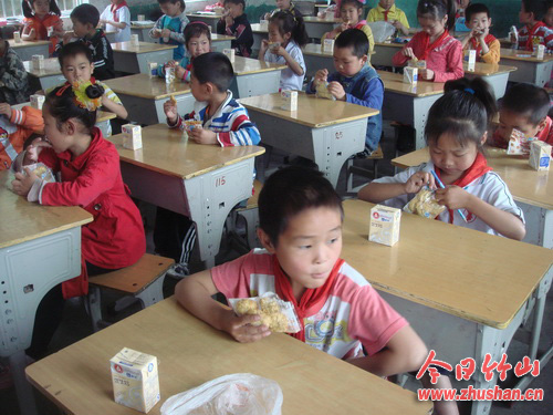 今日竹山网消息 6月13日课间,得胜小学各班的学生高兴地吃着免费的饼干、喝着学生奶。据悉,为让学生的课间餐吃的有营养、不吃厌,学校根据学生口味特点,除了给学生提供熟鸡蛋和学生奶的基础上,还为学生提供了饼干、蛋糕和面包等。孩子们开心地说:“除学生奶外,每天都吃鸡蛋,时间长了,还真不好吃。现在好了,学校又为我们换口味提供了饼干、蛋糕和面包等”。 营养餐的多样化很受学生欢迎,让学生吃得开心。(万飞)