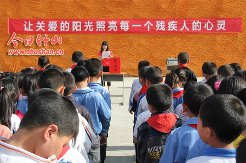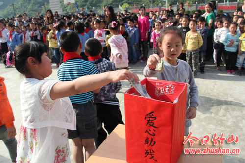 今日竹山网消息 在全国第22个“全国助残日”来临之际,5月17日上午,官渡中心学校全体师生积极参加“助残献爱心”活动,现场共募捐到爱心款1753.6元。(刘启明摄)