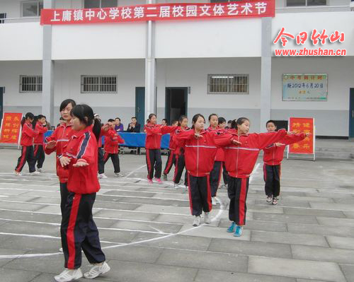 今日竹山网消息 欢快的节奏,催人奋进;跳跃的音符,荡人心弦;青春的火花,在节奏中迸发。5月3日上午,在上庸镇中心学校第二届校园文化艺术节校园集体舞比赛现场,学生们伴随着轻快悠扬的音乐翩翩起舞,饱满的激情,潇洒的动作,优美的舞姿,舞动着青春的旋律,展现着无限风采。 (许海涛)