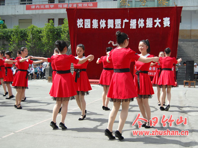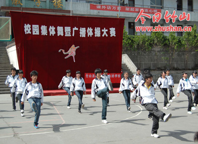 今日竹山网消息 4月27日,县职业技术集团学校操场上热闹非凡。伴随着优美的旋律、轻快的乐曲,学生排着整齐的方队翩翩起舞,跳跃、拉手、旋转……歌声笑声充满校园,给整个校园舞出了一道亮丽的风景。