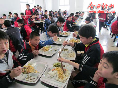 今日竹山网消息 4月25日中午,麻家渡镇九年制学生食堂里,千余名师生共进午餐,陪餐教师一边吃饭一边询问学生对食堂饭菜的意见和建议。