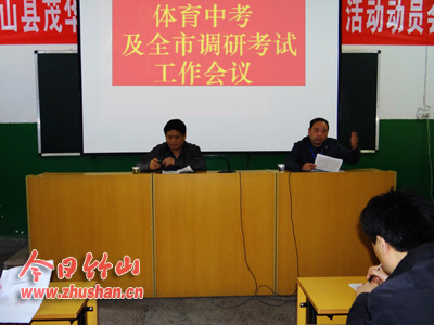 今日竹山网消息 4月18日下午,茂华中学九年级全体教师在大会议室召开了“体育中考及全市调研考试工作会议”。会议对即将进行的体育中考和调研考试相关事宜进行了周密的部署安排。