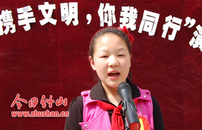 今日竹山网消息 “文明礼仪从我做起,我们都要积极投身‘三城联创’的活动中,为建设幸福文明家园贡献一份力量。”4月6日,县实验小学举行“携手文明,你我同行”演讲赛,来自各班的选手纷纷登台演讲,为“三城联创”鼓与呼。