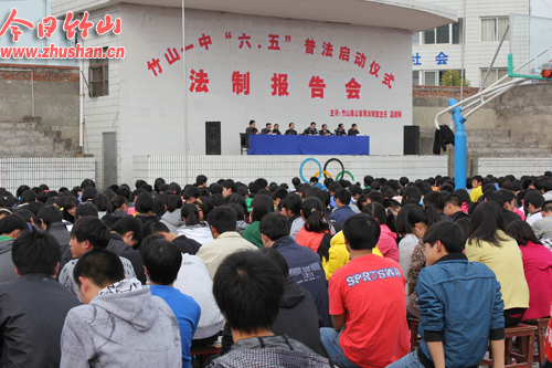 今日竹山网消息 为加强学生安全法制教育,预防校园内外违法犯罪和意外伤害,提高学生法律意识和法制观念,建设安全、文明、和谐的校园,3月27日,竹山一中举行了“六·五”普法启动仪式暨法制教育报告会。