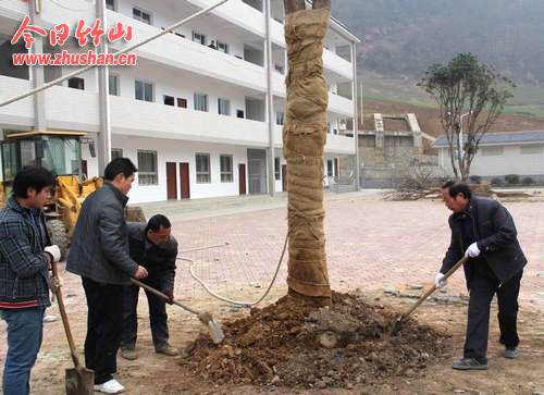 今日竹山网消息 又是一年植树节,校园绿化掀高潮。3月12日,官渡中心学校组织教师在教学楼前绿化带栽植直径28公分以上的樟树、桂花6株(如图)。