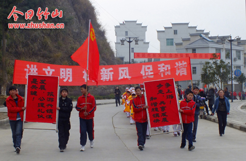 今日竹山网消息 3月2日,上庸镇中心学校800多名师生组成4个方阵(仪仗方阵、鼓号队、小学部方阵、初中部方阵),手举宣传牌,走上街头,向广大居民宣传文明礼仪及和谐的重要性,他们不时地喊道:“上庸是我家 建设靠大家”,“倡导文明礼仪 共建和谐家园”。