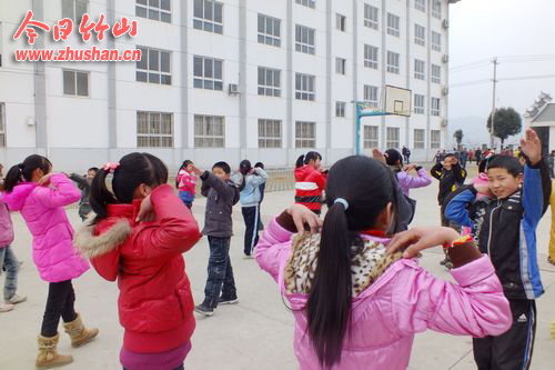 今日竹山网消息 “小小的一片云呀慢慢地走过来 ,请你们歇歇脚呀,暂时停下来……”在上庸镇中心学校初中部操场上,学生随着音乐的节奏学跳新版(湖北版)校园集体舞。