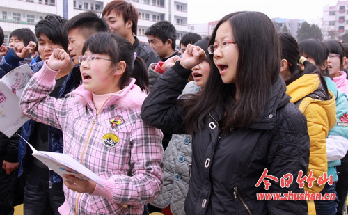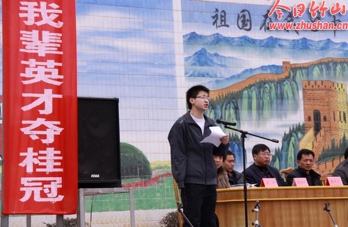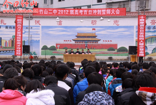 今日竹山网消息 2月27日下午,竹山二中悬挂起“一腔热血万丈豪情我辈英才夺桂冠,十载寒窗百日苦练何人健步登金榜”巨幅标语,该校2012届高考百日冲刺誓师大会隆重召开。校长储照安作了誓师动员讲话,号召同学们要有“海到无边天作岸,山登绝顶我为峰”的凌云壮志;有“千淘万漉虽辛苦,吹尽狂沙始到金”的不屈精神;有“决战百日,备考亮剑,狭路相逢勇者胜”的一腔豪情;有“众志成城,团结协作,再创辉煌”的备考信念;有“脚踏实地,心态平和”的备考方法,全力备战高考。3名教师代表、3名学生代表也分别作了表态发言。大会对“一诊”考试中取得优异成绩的学生给予表彰并颁发了奖金。最后,全体高三年级的师生高高举起右手宣誓,激情澎湃、掷地有声地宣誓是圆青春梦想的动员令,是扬人生志气的进军号。(朱本双 李淼)