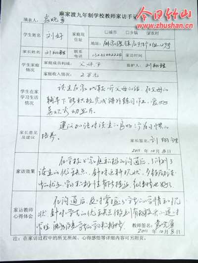 今日竹山网消息 自9月份以来,麻家渡镇234名教师分成95个小组,利用课余时间对全镇21个村进行了大走访。学校要求对有学生的家庭,家访教师要认真填写《家访手记》,全面了解学生的家庭成员、经济状况、个性特长、行为习惯等情况,为学生的健康成长掌握了第一手材料。通过家访,形成了学校、家庭、社区“三位一体”的教育格局。(刘东)