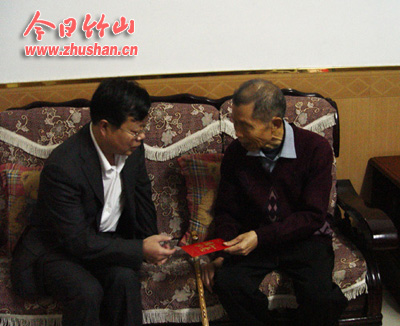 上午8点,外面还下着小雨,教育局长李大智一行三人来到局机关退休老干部周光田家。周光田今年73岁,患帕金森综合症多年,妻子无业,在老人家里,李局长详细了解其家庭收入和老人现阶段的身体状况、医疗费用等情况,并向老人送上慰问金。