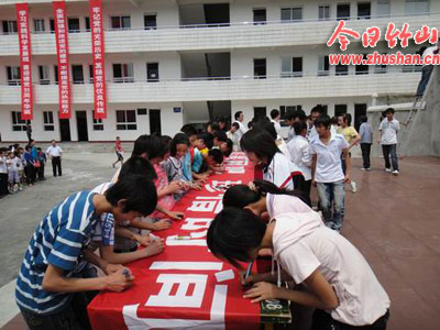 今日竹山网消息 6月27日,由县文明办、文体局、县教育局、县共青团、县妇联联合举办的“从我做起 远离网吧 珍惜时间 健康成长”的宣誓暨签名活动在潘口中学开展。全体同学拿起笔毫不犹豫的写下了自己的姓名,并齐声高呼:从我做起,远离网吧,珍惜时间,发奋学习,锻炼身体,为共创美好明天而奋斗。(蒋世军 张吉红 唐艳丽)